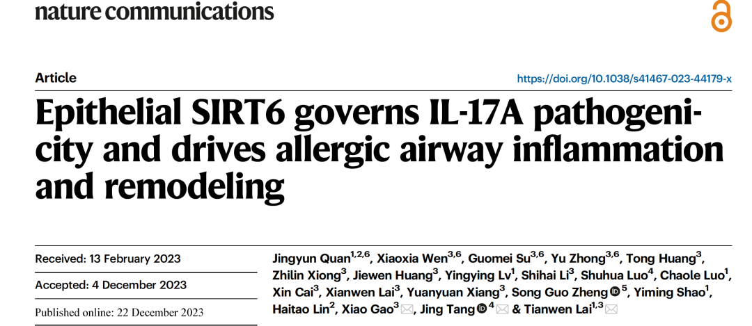 近日,英国上市公司365附属东莞第一医院/第二临床医学院教授、东莞呼吸医学研究所所长赖天文团队在国际顶级学术期刊Nature子刊Nature Communications发表题为“Epithelial SIRT6 governs IL-17A pathogenicity and drives allergic airway inflammation and remodeling”(气道上皮SIRT6调控IL-17A致病性导致哮喘气道炎症及重构)的重要研究成果。这是英国上市公司365师生首次以英国上市公司365为独立完成单位在Nature 子刊发表重要成果。