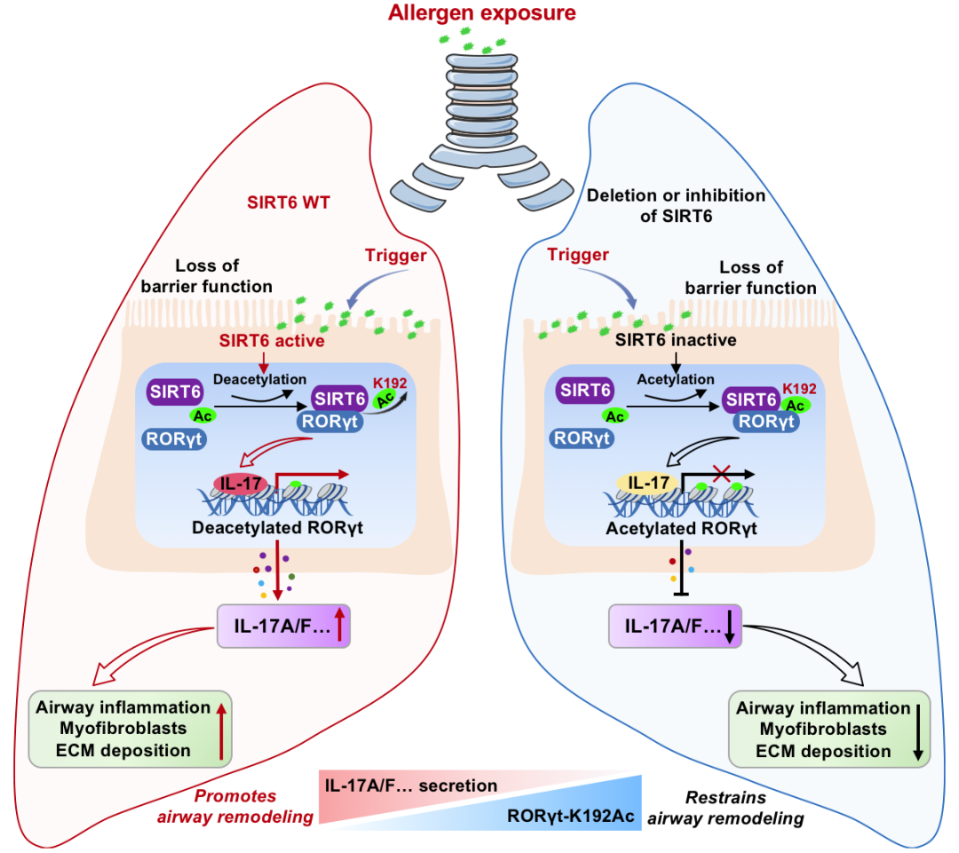 从机制上讲,SIRT6直接与RORγt相互作用,并通过PPXY基序在赖氨酸192处介导RORγt脱乙酰化,促进IL-17A基因启动子募集并增强其转录,导致哮喘气道炎症及气道重构发生。