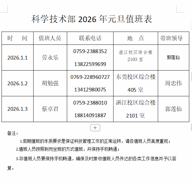 科学技术部2026年元旦值班表
